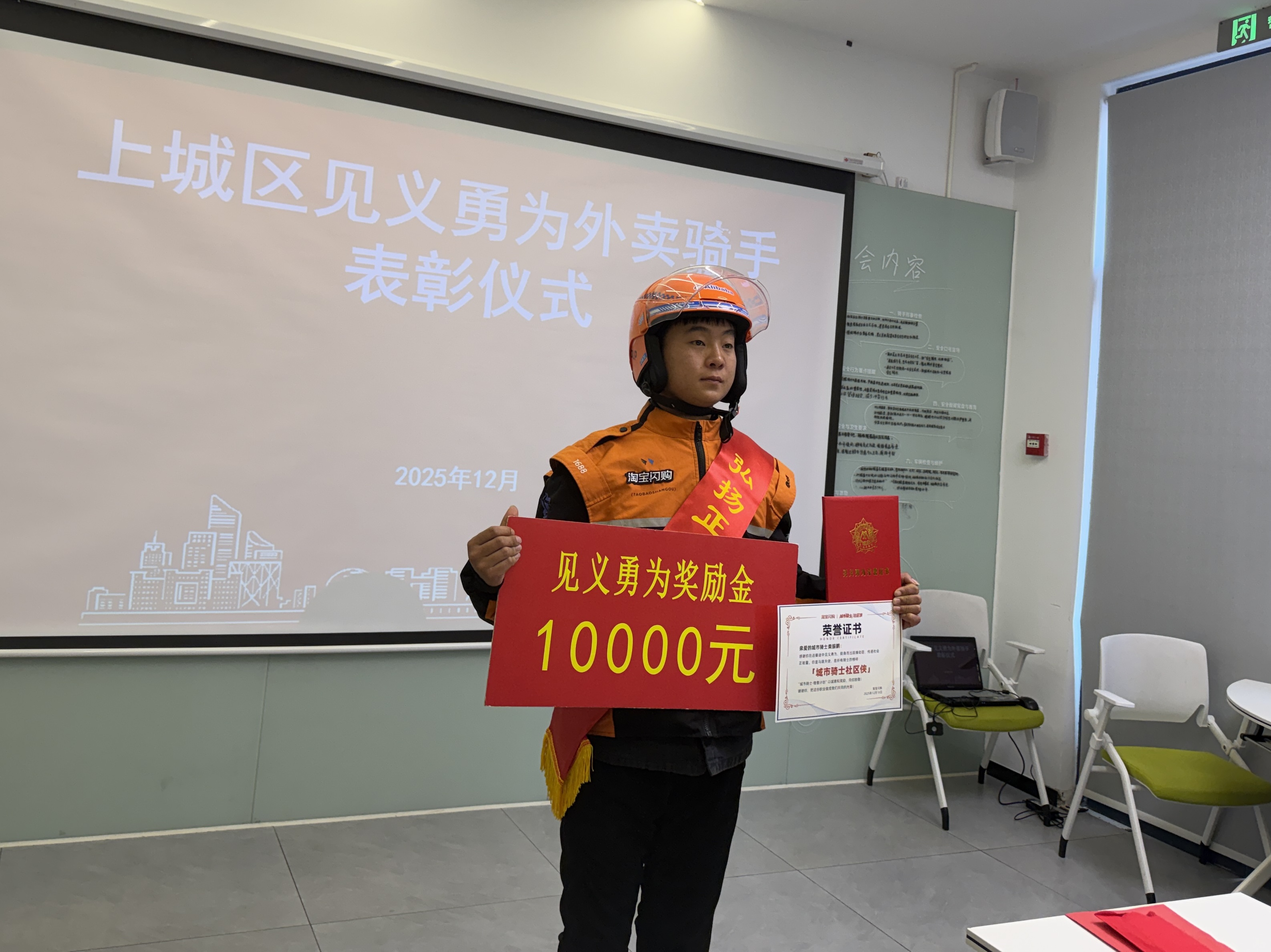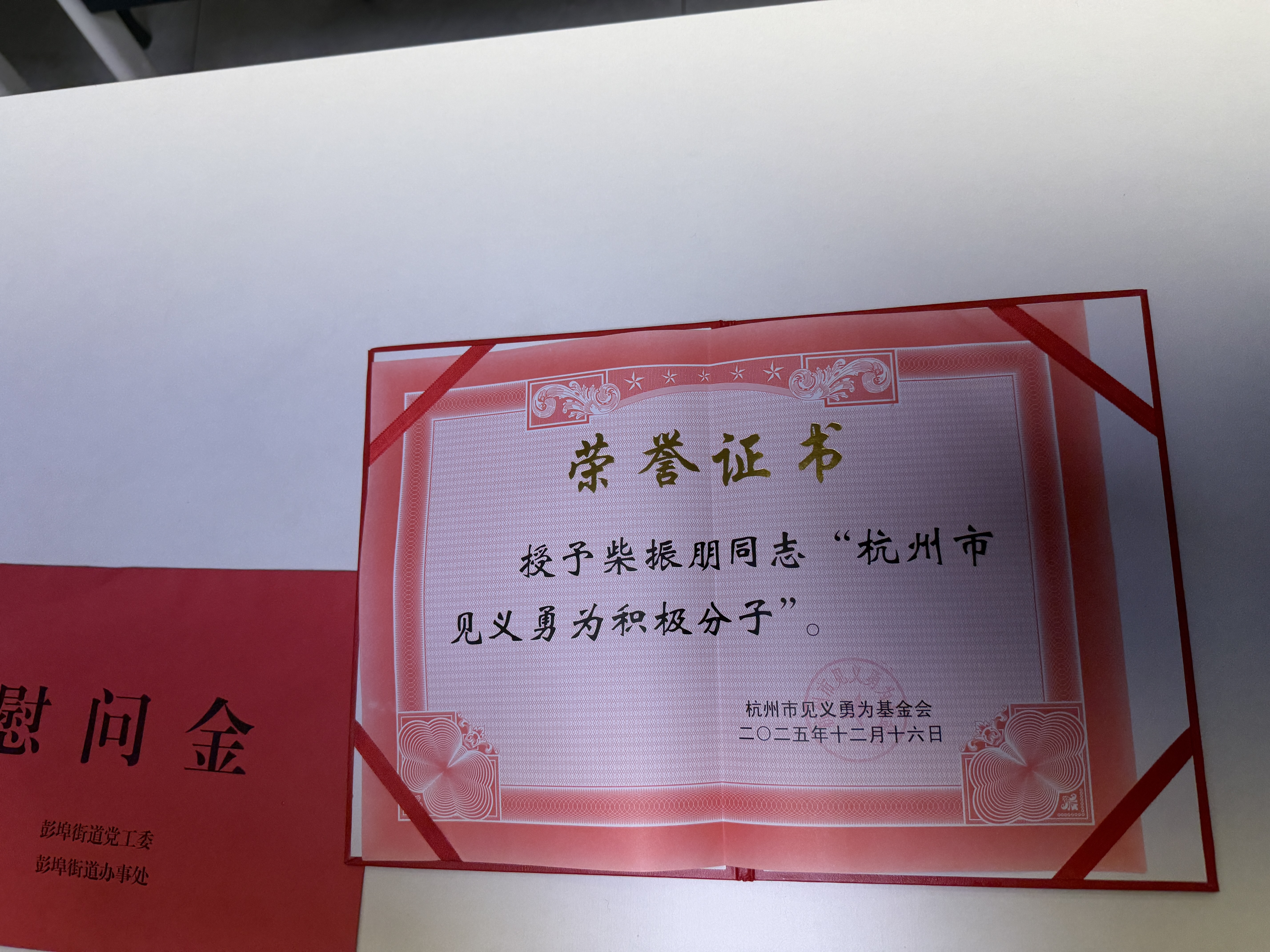 12月16日下午,杭州市上城区举行见义勇为外卖骑手表彰仪式,对柴振朋的勇敢行为给予表彰和奖励。同时,因其见义勇为的表现,他所属的平台淘宝闪购也授予他“城市骑士社区侠”荣誉称号,并给予1万元现金奖励。